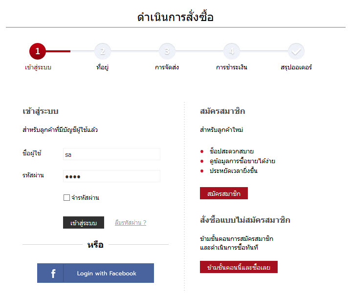 3. ในกรณีที่กดปุ่ม ชำระเงิน ระบบจะนำท่านเข้าสู่หน้า เข้าสู่ระบบ ซึ่งสามารถกรอกชื่อผู้ใช้และรหัสผ่านสำหรับท่านที่เป็นสมาชิกแล้ว หรือ สมัครสมาชิกใหม่ หรือ เลือกสั่งซื้อสินค้าโดยไม่สมัครสมาชิก