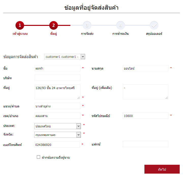 4. หากท่านเข้าสู่ระบบโดยใช้รหัสผู้ใช้งาน หรือสั่งซื้อโดยไม่สมัครสมาชิก ระบบจะแสดงข้อมูลการจัดส่งสินค้า ให้ท่านกรอกชื่อที่อยู่สำหรับติดต่อ และ ชื่อที่อยู่สำหรับจัดส่ง จากนั้นกด ถัดไป